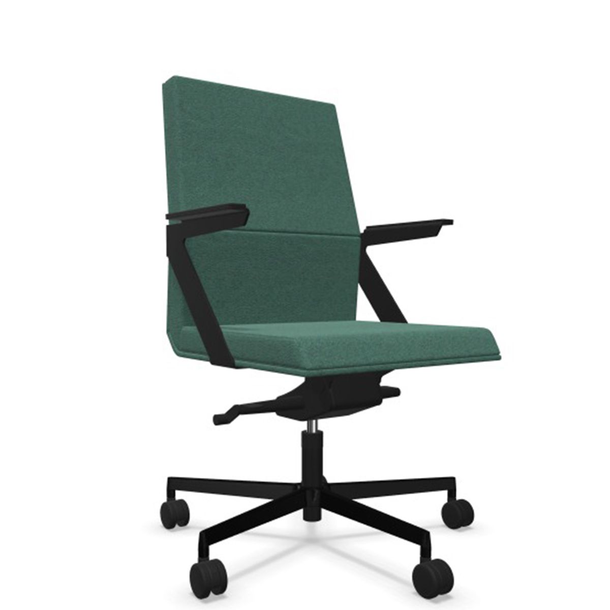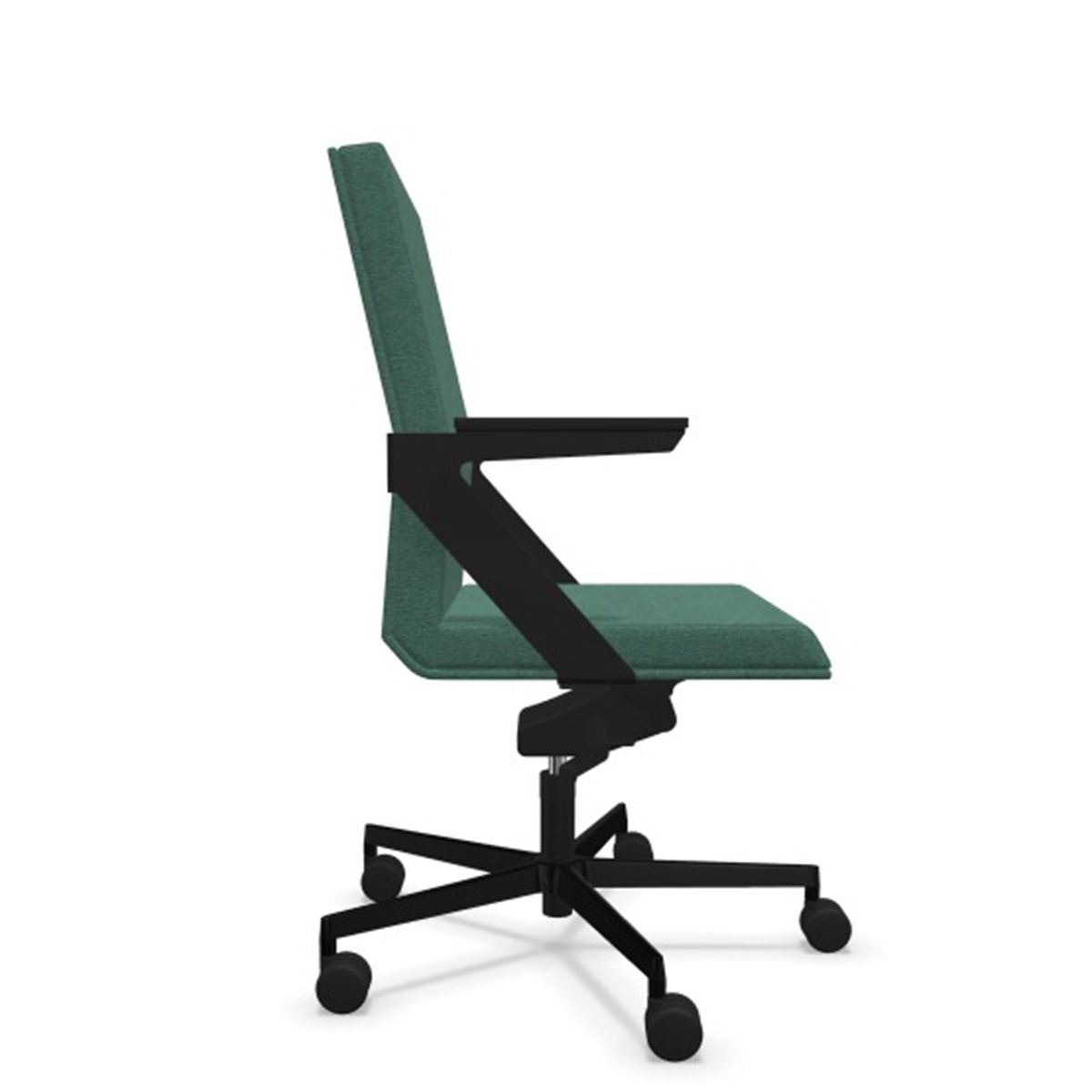 Fotel z niskim oparciem i z podłokietnikami, na krzyżaku 5-ramiennym aluminiowym malowanym proszkowo na rolkach, z mechanizmem kołyskowym, manualną regulacją odchylenia fotela z możliwością zablokowania w 4 pozycjach, z regulacją siły nacisku i z regulacją wysokości siedziska.