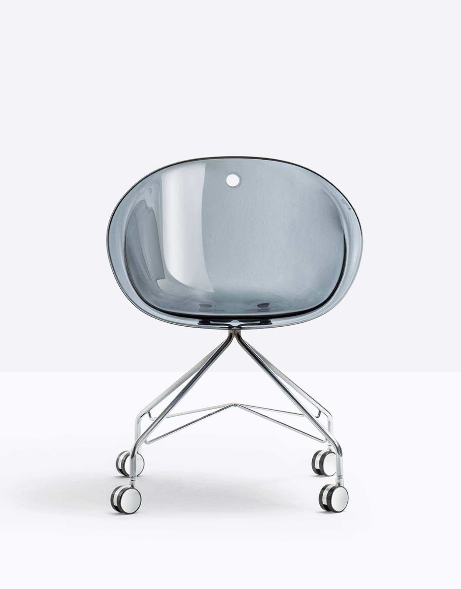 Pedrali Gliss 968 Gliss ma przytulny i ergonomiczny kształt inspirowany kultowymi krzesłami z lat pięćdziesiątych, z charakterystycznym otworem w skorupie. Kolekcja wyróżnia się wygodą i funkcjonalnością, jaką zapewniają faliste podłokietniki otulające ciało i łatwość obsługi. Fotel ze skorupą z poliwęglanu i ramą z rur stalowych Ø16mm z kółkami. |