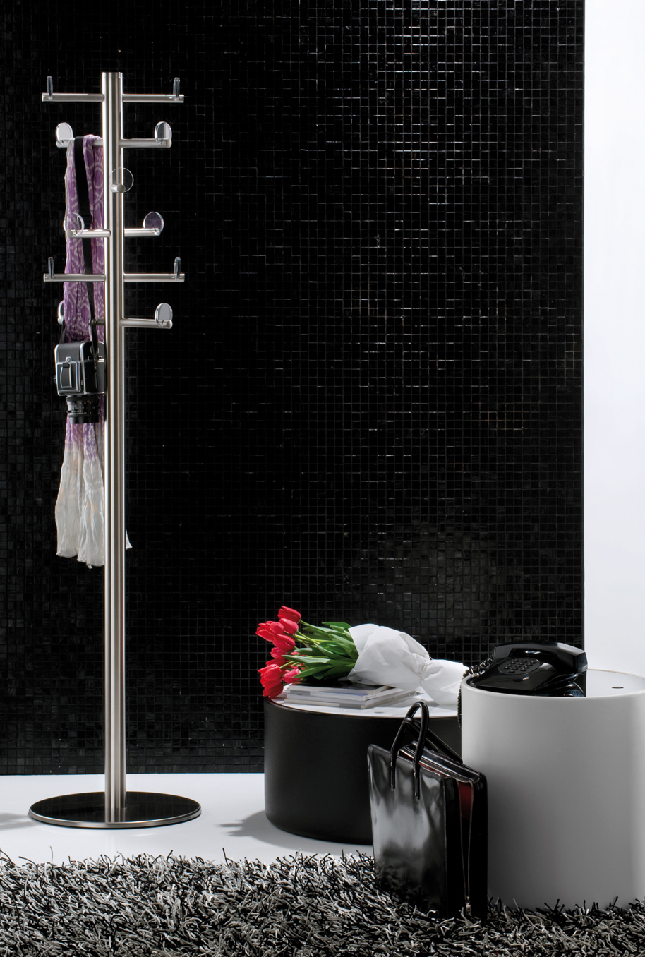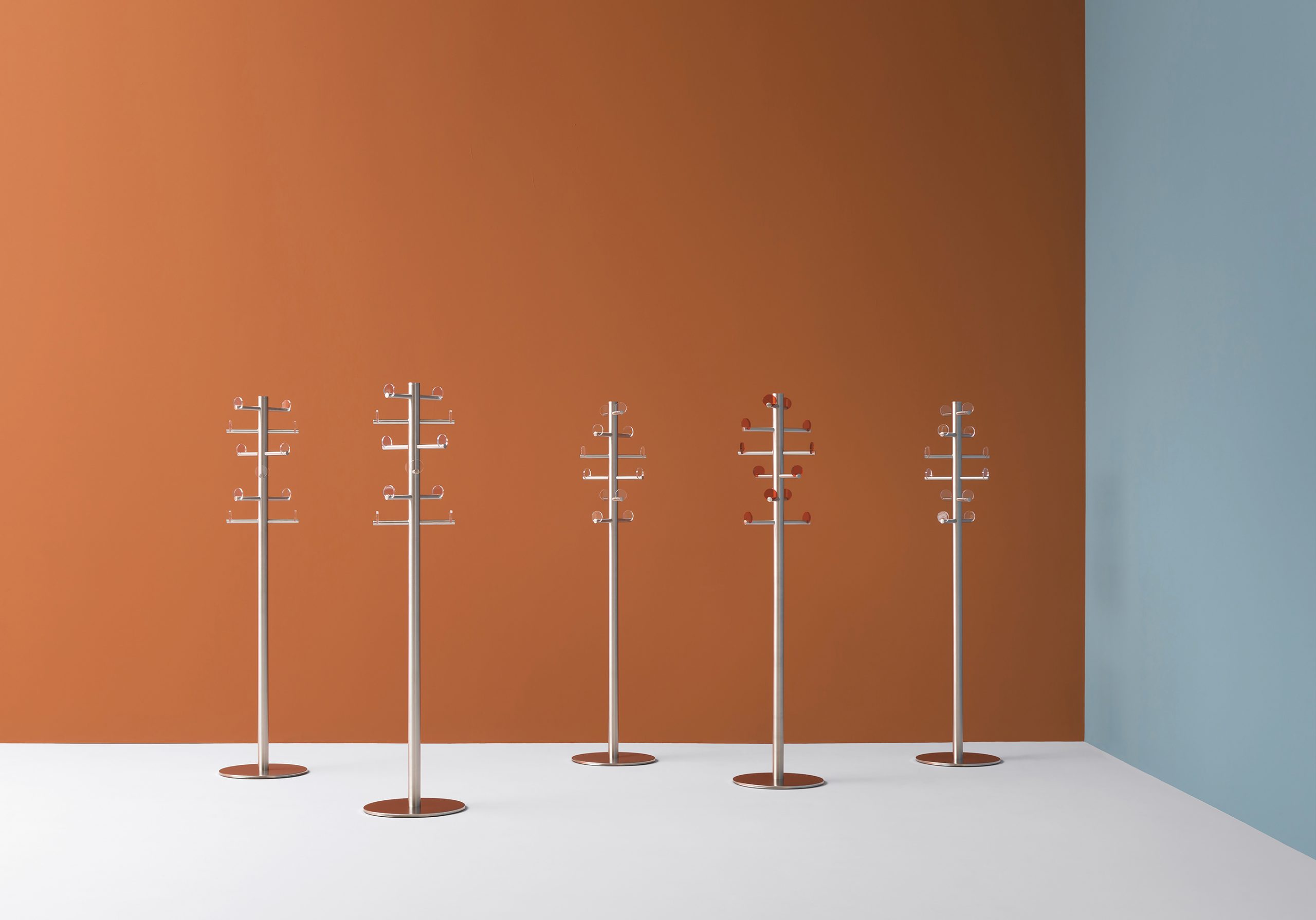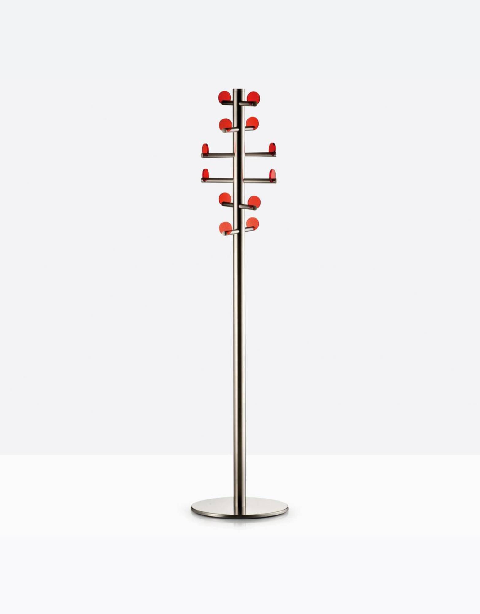 Voilà 5130 to designerski, wolnostojący wieszak na ubrania. Wykonany z wycinanej laserowo, szczotkowanej stali nierdzewnej, składający się z podstawy, kolumny i ramienia. Jego unikalność tkwi w przezroczystych dyskach z metakrylanu, które uczyniają go niezwykle funkcjonalnym. To doskonałe rozwiązanie do przechowywania ubrań w stylowy sposób.